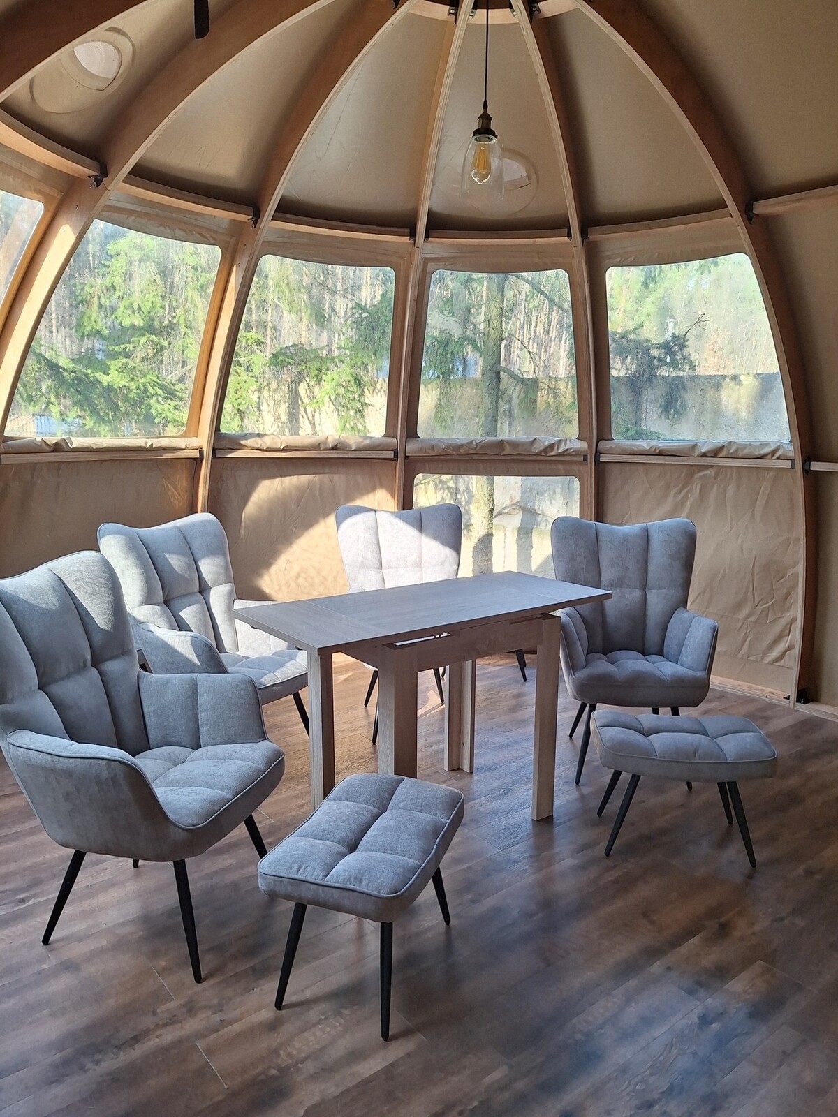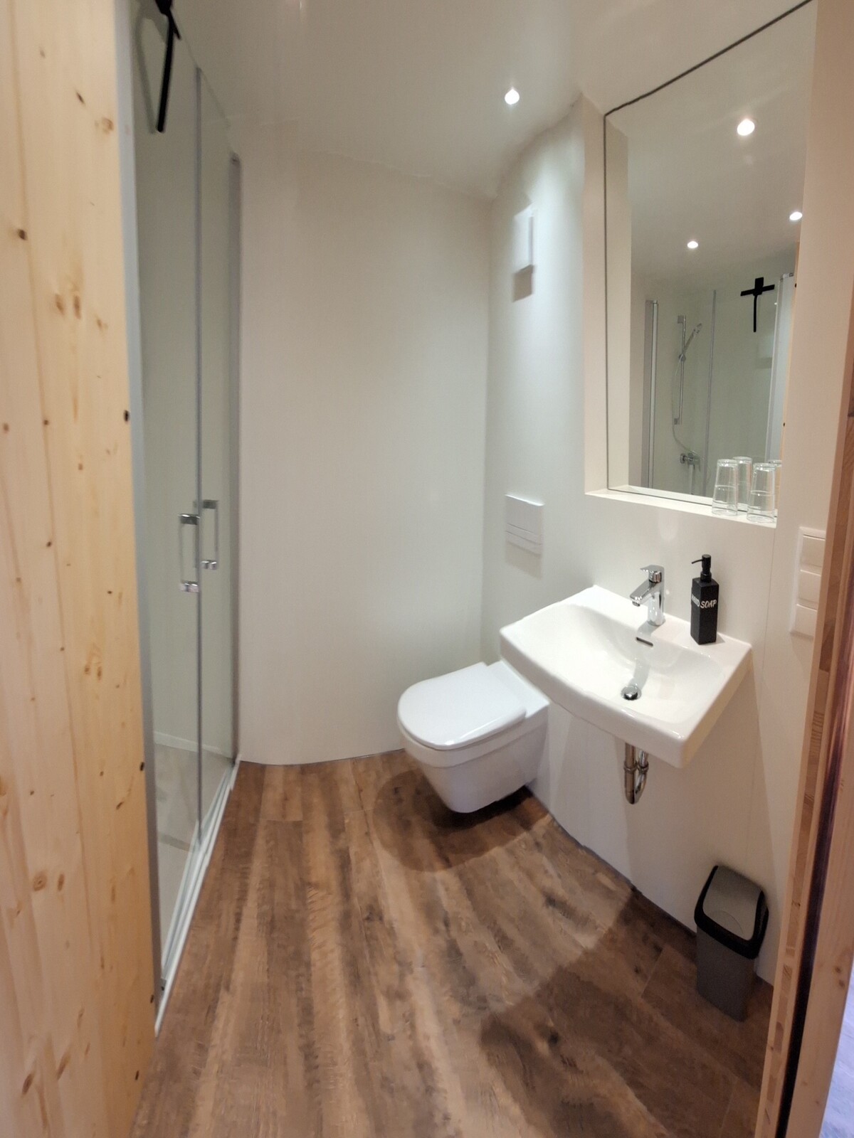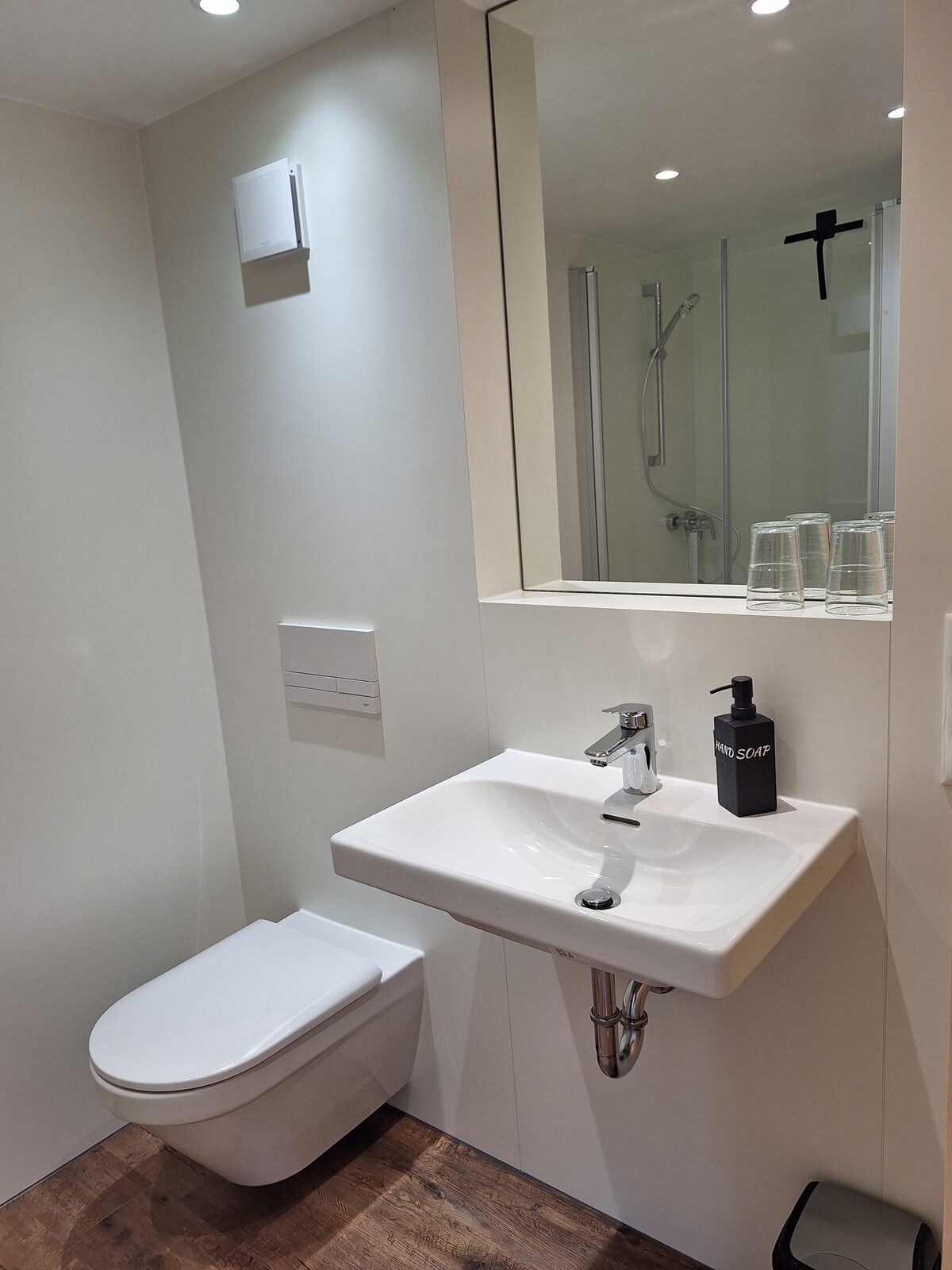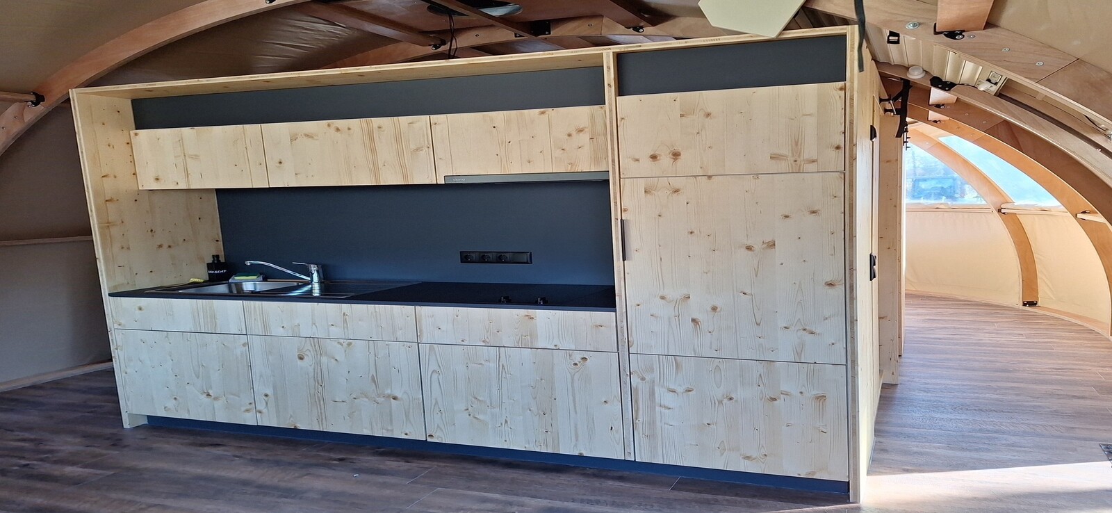 Jedes unserer Ferienhäuser hat ein privates Bad, mit Küchenzeile und Wohnbereich.